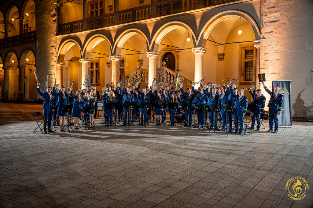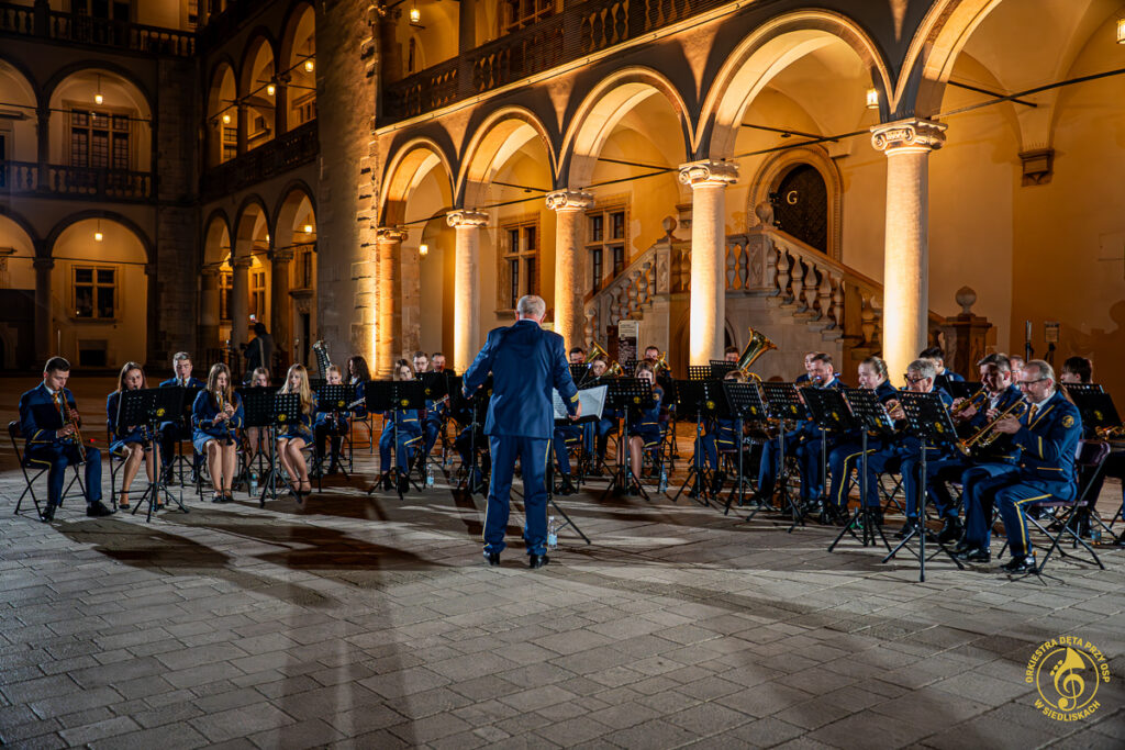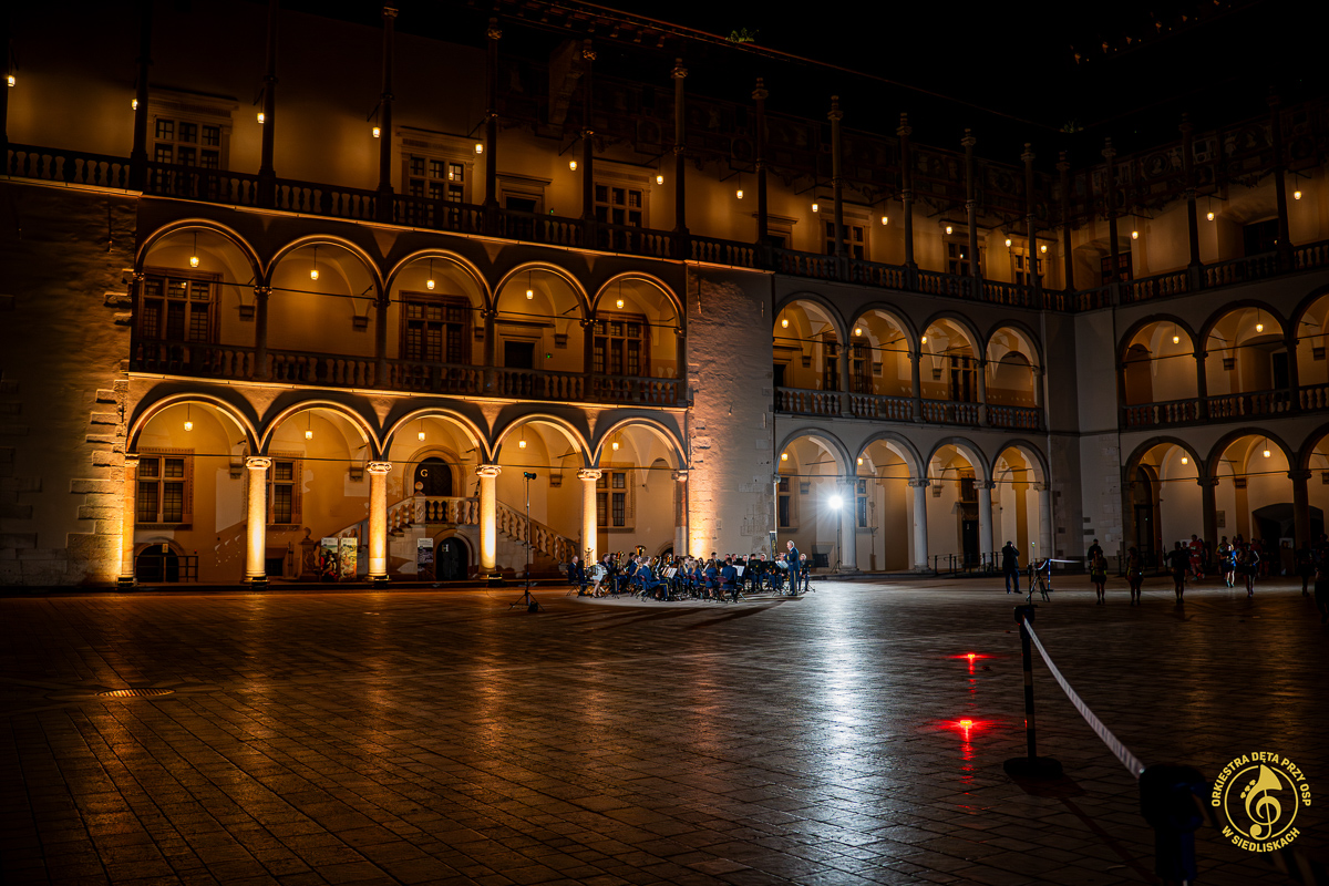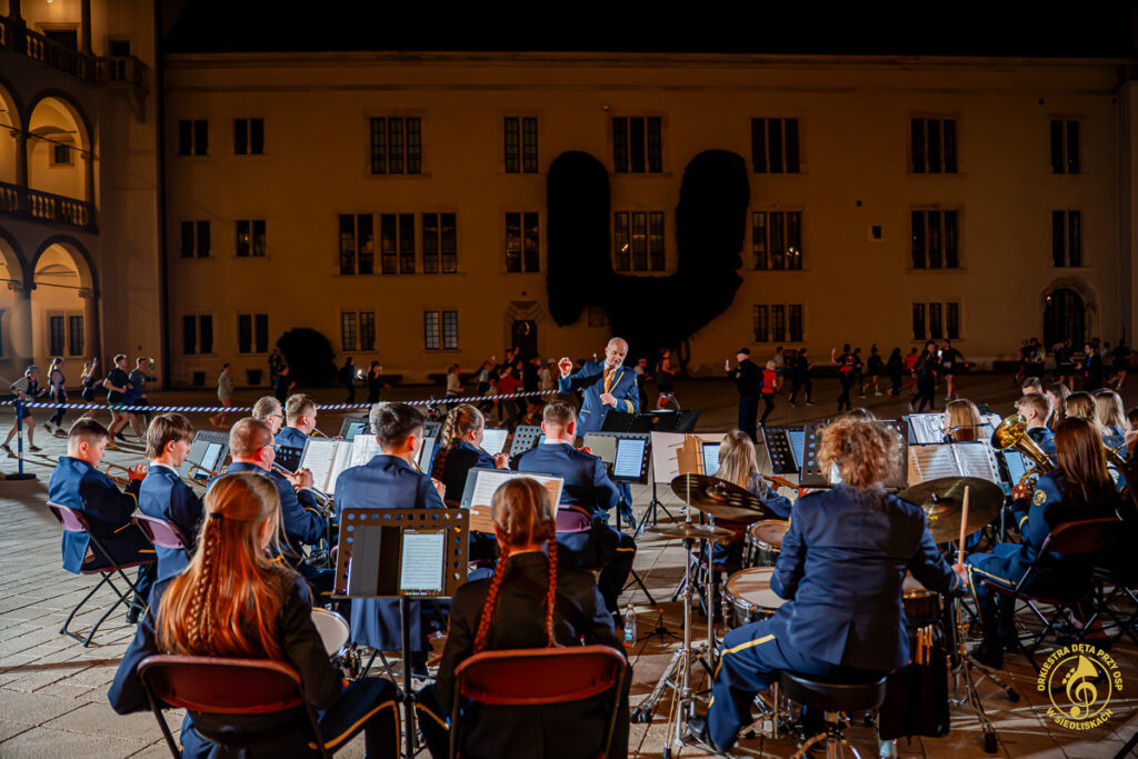 Od samego początku dało się czuć magię tego miejsca i piękno jego historii. Po krótkich ustaleniach z panem Grzegorzem – Komendantem Straży Zamkowej na Wawelu, rozpoczęliśmy przygotowania. Zostaliśmy ugoszczeni w Centrum Wystawowo-Konferencyjnym, gdzie mogliśmy przeprowadzić krótką próbę. Następnie szybka zmiana strojów i zajęcie miejsc w docelowej lokalizacji. Każdy z nas czuł ogromne podekscytowanie, a pięknie oświetlone mury tylko potęgowały wyjątkowy klimat tego wieczoru.